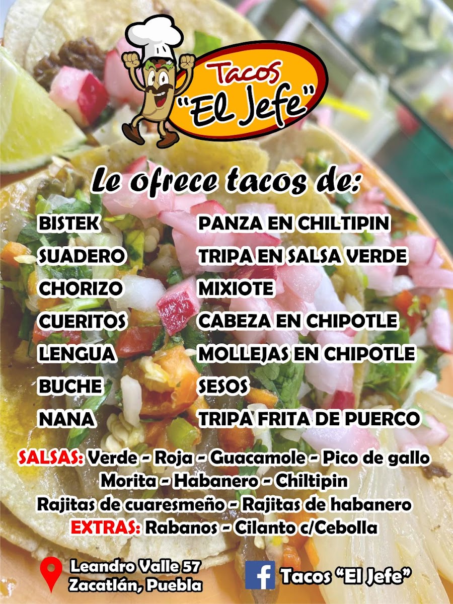 Tacos El Jefe, located at Av. Leandro Valle 57, Parque Hundido, Puebla, offers a flavorful array of traditional Mexican dishes that highlight the authentic taste of the region. One of the standout items on their menu is the Taco de Panza, a delicious taco filled with tender, slow-cooked pork belly. This dish offers a perfect balance of savory flavors, with the pork belly being crispy on the outside yet juicy on the inside. The taco is generously seasoned and served in a soft corn tortilla, making it an irresistible choice for taco lovers.